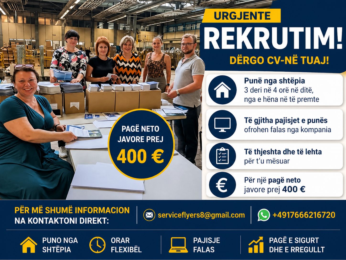 • Ne po rekrutojmë individë dinamikë për një pozicion pune nga shtëpia, 3 deri në 4 orë në ditë, nga e hëna në të premte. •Të gjitha pajisjet e punës ofrohen falas nga kompania. •Të thjeshta dhe të lehta për t'u mësuar. •Për një pagë neto javore prej 400 €. •Për më shumë informacion, ju lutemi na kontaktoni direkt në: [email protected] ose whatsapp: +4917666216720