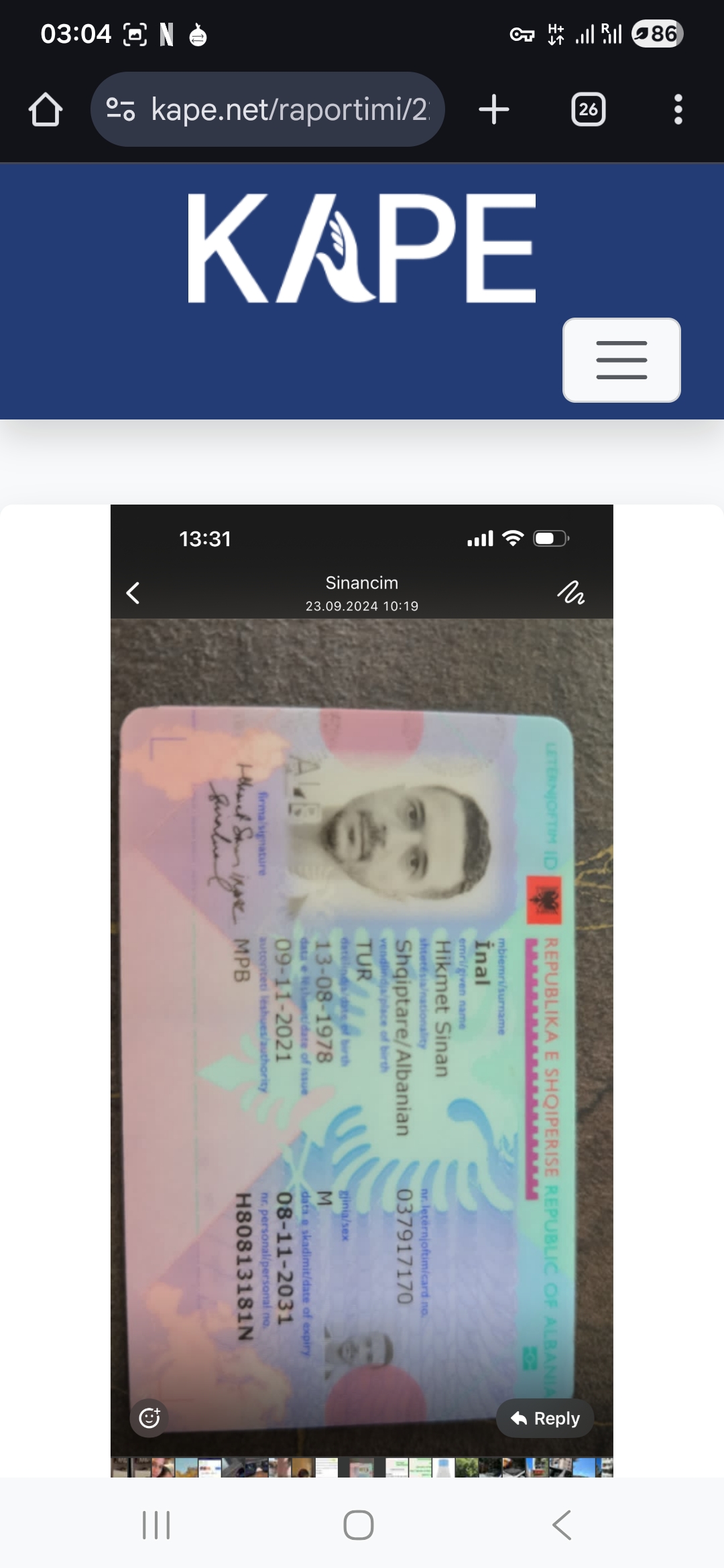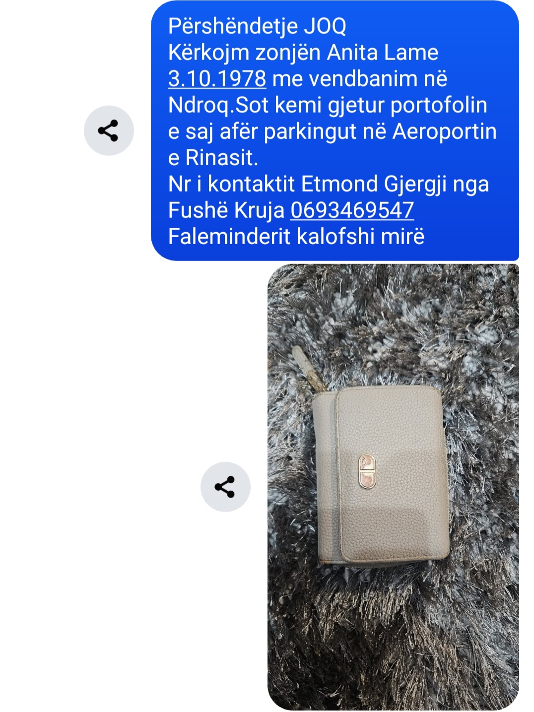 Pershendetje Une jam personi qr ka humbur portofolin dhe portofoli eshte gjetur tani. Te lutem hiqeni njoftimin se permban dhenat personale si numer telefoni dhe karte identiteti. Faleminderit Hikmet sinan inal 0696010050